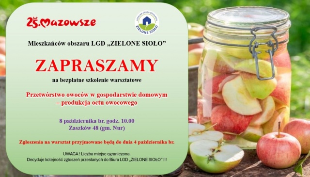 Lokalna Grupa Działania "Zielone Sioło" zaprasza mieszkańców na bezpłatne szkolenie warsztatowe z cyklu "Mazowieckie Dobre Praktyki i Tradycje Kulinarne". Tematem spotkania będzie "Przetwórstwo owoców w gospodarstwie domowym - produkcja octu owocowego", które odbędzie się 8 października w remizie OSP w Zaszkowie, gm. Nur.