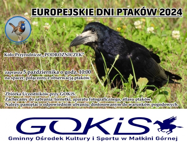 W pierwszy weekend października po raz kolejny obchodzone będą Europejskie Dni Ptaków, a GOKiS Małkinia Górna zaprasza wszystkich miłośników przyrody na wyjątkową wycieczkę z okazji tego wydarzenia. 5 października o godzinie 10:00 pod patronatem Ogólnopolskiego Towarzystwa Ochrony Ptaków wyruszymy na bezpłatną wycieczkę, której celem będzie obserwacja migrujących ptaków.