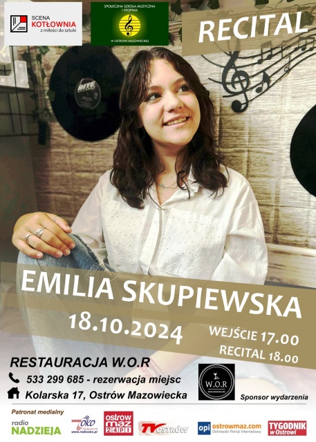 Społeczna Szkoła Muzyczna I stopnia w Ostrowi Mazowieckiej, we współpracy z Teatrem Scena Kotłownia, organizuje kolejny recital z popularnego cyklu "Rozśpiewana Ostrów". To już 31. edycja tego wydarzenia, które regularnie przyciąga miłośników muzyki i młodych talentów z regionu. Tym razem w Restauracji W.O.R. wystąpi Emilia Skupiewska, uczennica Społecznej Szkoły Muzycznej oraz Szkoły Podstawowej im. kard. Stefana Wyszyńskiego w Szulborzu Wielkim.