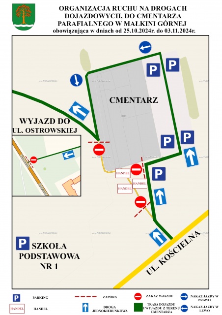 W okolicach cmentarza wprowadzony zostanie ruch jednokierunkowy. Kierowcy będą mogli wjechać na parking wyłącznie od strony ul. Cmentarnej, ponieważ przed cmentarzem będzie prowadzony handel. Aby wyjechać z parkingu, kierowcy będą musieli objechać cmentarz drogą gruntową, która prowadzi wokół wschodniego oraz północnego muru cmentarza. Kierowcy poruszający się tą trasą, wyjadą na drogę umożliwiającą wyjazd na ul. Ostrowską, w pobliżu Szkoły Podstawowej nr 1 im. Marii Curie-Skłodowskiej.