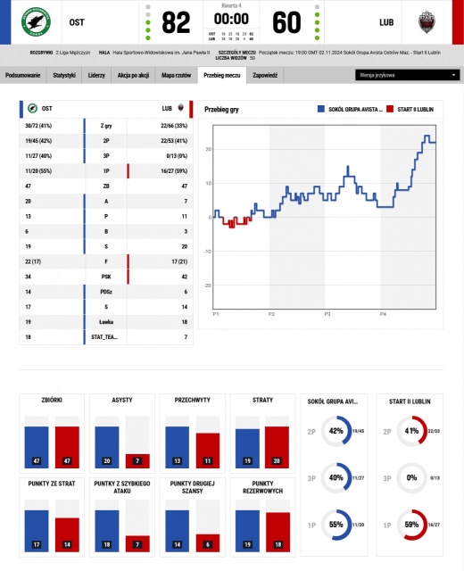 Obie drużyny były bardzo zbliżone w walce na tablicach, zanotowały po 47 zbiórek. Sokół jednak wykazał się lepszą organizacją w grze zespołowej, notując aż 20 asyst przy zaledwie 7 asystach Startu. Wynik wsparcia z ławki był dość wyrównany - rezerwowi Sokoła zdobyli 19 punktów, a Startu - 18. Zdecydowaną różnicę zrobiła jednak skuteczność w szybkich atakach: Sokół zdobył aż 18 punktów z kontrataków, podczas gdy Start tylko 7, co było widoczne w dynamice gry gospodarzy.