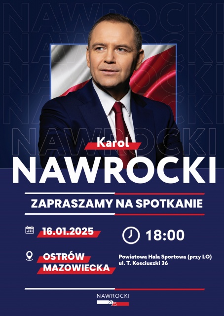 Do Ostrowi Mazowieckiej przyjedzie kolejna osoba, która będzie ubiegać się o urząd prezydenta RP. Tym razem będzie to Karol Nawrocki. Wydarzenie zaplanowano na 16 stycznia 2025 o godz. 18:00, w Powiatowej Hali Sportowej przy ul. T. Kościuszki 36, w pobliżu Liceum Ogólnokształcącego im. Mikołaja Kopernika. Celem spotkania jest umożliwienie mieszkańcom Ostrowi Mazowieckiej bezpośredniego kontaktu z kandydatem oraz poznanie jego stanowiska w ważnych sprawach społecznych i politycznych.