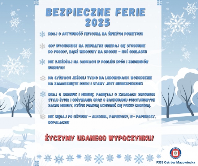 Kontrole organizowanych obozów, kolonii oraz innych form wypoczynku odbywają się zgodnie z wymaganiami elektronicznej bazy wypoczynku. Dodatkowo, w ramach akcji edukacyjnej, pracownicy sekcji promocji zdrowia PSSE przeprowadzą w miejscach zorganizowanego wypoczynku zajęcia, które będą zarówno ciekawe, jak i atrakcyjne. Podczas spotkań dzieci i młodzież będą mogły poznać zasady zdrowego stylu życia, a także przypomnieć sobie, jak ważne jest dbanie o higienę i bezpieczeństwo w czasie zimowego odpoczynku.