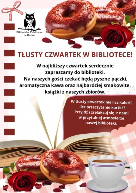 Pracowniczki biblioteki zapraszają serdecznie wszystkich mieszkańców Broku i okolic do wspólnego świętowania Tłustego Czwartku. Niech ten dzień stanie się prawdziwą ucztą dla zmysłów, pełną radości, śmiechu i niezapomnianych chwil.