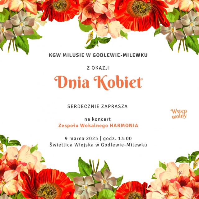 Z okazji Dnia Kobiet Koło Gospodyń Wiejskich "Milusie" w Godlewie-Milewku zaprasza na koncert zespołu wokalnego Harmonia. Wstęp na koncert jest całkowicie bezpłatny.