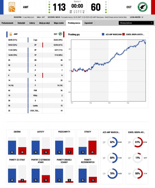 Statystyki meczowe pokazują dominację zespołu z Warszawy, który świetnie radził sobie zarówno w ataku, jak i w obronie. AZS AWF zakończył spotkanie ze skutecznością 51% z gry (44/85), w tym aż 50% z dystansu (11/22), co stanowiło istotny element ofensywy. Gospodarze byli również bardzo skuteczni w rzutach za dwa punkty, trafiając 52% (33/63). Sokół miał trudności ze zdobywaniem punktów, szczególnie zza łuku, gdzie zaledwie 11% skuteczności (3/27). Właśnie to sprawiło, że nie ostrowianie byli w stanie zagrozić stołecznej drużynie. Łączna skuteczność drużyny Sokoła wyniosła zaledwie 39% (25/63), co pokazuje problemy z precyzyjnym oddawaniem rzutów.