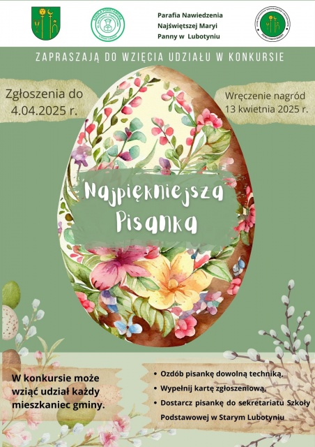 Zgłoszenia do konkursu przyjmowane są do 4 kwietnia 2025. Wręczenie nagród odbędzie się w Niedzielę Palmową, 13 kwietnia 2025, podczas mszy o godz. 10:00 w kościele parafialnym w Starym Lubotyniu.