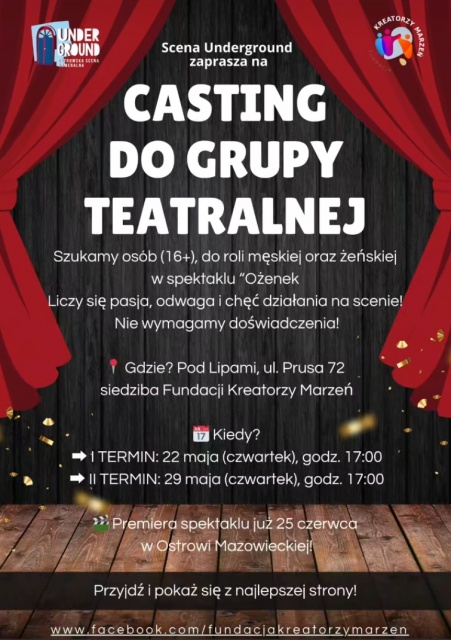 Scena Underground ogłasza casting do grupy teatralnej, poszukując osób w wieku 16+ do ról męskich oraz żeńskich w nadchodzącym spektaklu "Ożenek". Ogłoszenie skierowane jest do osób z pasją, odwagą i chęcią działania na scenie. Organizatorzy podkreślają, że doświadczenie aktorskie nie jest wymagane.