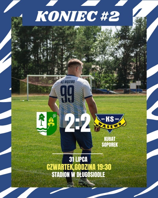W drugiej odsłonie spotkania tempo gry nieco spadło, a obie drużyny skupiły się na bardziej wyważonej grze w środku pola. Dzięki temu pojawiło się więcej przestrzeni na skrzydłach, co pozwoliło stworzyć kilka groźnych sytuacji. Spotkanie zakończyło się wynikiem 2:2, co jest dobrym prognostykiem dla drużyny KS Wąsewo, biorąc pod uwagę fakt, że rywal był przedstawicielem wyższej klasy rozgrywkowej.