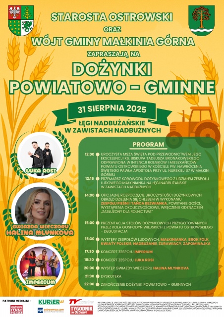 Organizatorzy wydarzenia zastrzegają sobie prawo do zmian w programie. Organizatorami Dożynek Powiatowo-Gminnych są: Starostwo Powiatowe w Ostrowi Mazowieckiej oraz Urząd Gminy w Małkini Górnej.