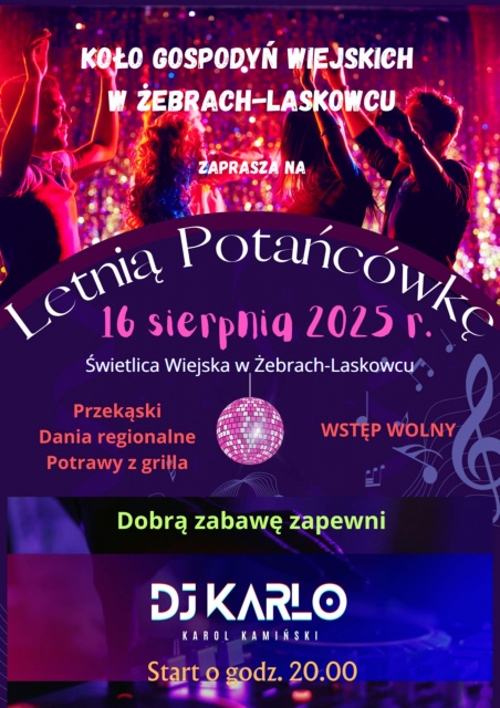 Letnia potańcówka w świetlicy wiejskiej w Żebrach-Laskowcu powraca! Organizowane przez Koło Gospodyń Wiejskich w Żebrach-Laskowcu wydarzenie zapowiada się jako wieczór pełen energii i atrakcji. Start w sobotę, 16 sierpnia 2025 o godz. 20:00, a stery nad parkietem przejmie DJ Karlo, który zadba o świetną muzykę i taneczną atmosferę. Wstęp jest wolny -- każdy będzie mile widziany.