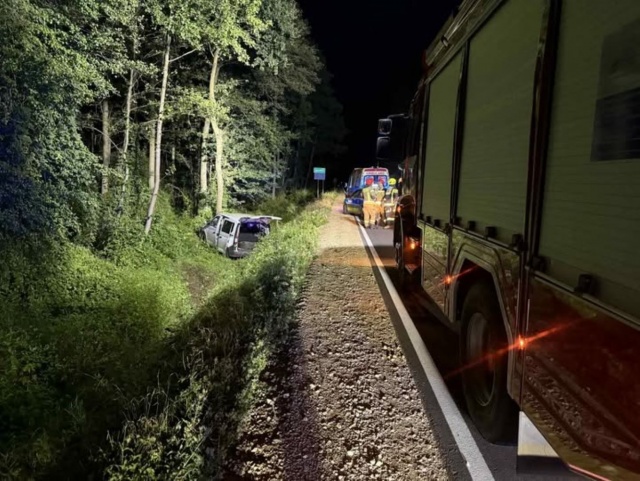 Na łuku drogi samochód osobowy marki Volkswagen Caddy zjechał z jezdni, przejechał przez głęboki rów i zatrzymał się na drzewie. Kierowcy udało się samodzielnie opuścić pojazd przed przybyciem ratowników. Na miejscu strażacy udzielili mu pierwszej pomocy przedmedycznej.