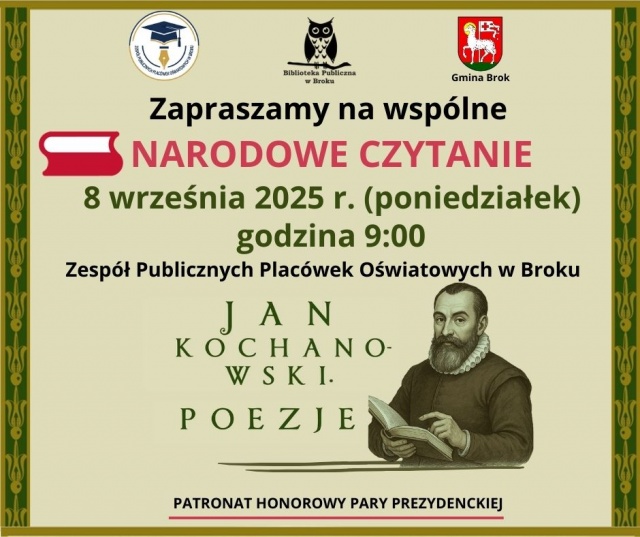 Poezja renesansowa zabrzmi w Broku podczas ogólnopolskiej akcji czytelniczej. Lokalna społeczność spotka się, by wspólnie odkrywać piękno i mądrość utworów Jana Kochanowskiego - poety, którego refleksje o życiu i przemijaniu pozostają aktualne do dziś.