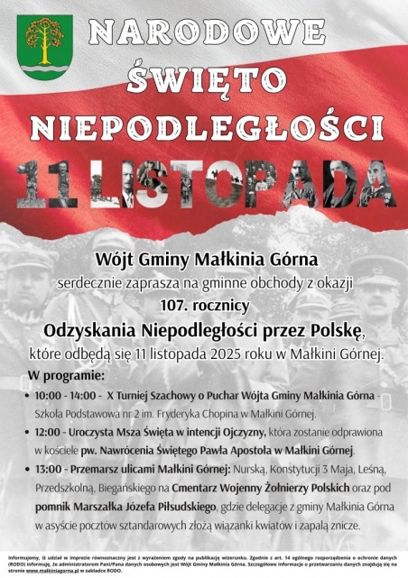 Po raz 107. świętujemy odzyskanie niepodległości. Nie inaczej będzie w Małkini Górnej, gdzie 11 listopada 2025 odbędą się uroczystości upamiętniające tę rocznicę. Obchody rozpoczną się o godz. 10:00 w Szkole Podstawowej nr 2 im. Fryderyka Chopina, gdzie odbędzie się X Turniej Szachowy o Puchar Wójta Gminy Małkinia Górna. Z kolei o godz. 12:00 w kościele pw. Nawrócenia św. Pawła Apostoła odprawiona zostanie msza święta w intencji ojczyzny, będąca duchowym wprowadzeniem do dalszych uroczystości.