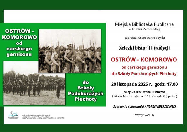 Wstęp na wydarzenie jest bezpłatny. Biblioteka zaprasza wszystkich chętnych do udziału w spotkaniu, które będzie okazją do poznania lokalnej historii wojskowej i jej znaczenia dla rozwoju Ostrowi Mazowieckiej i Komorowa.