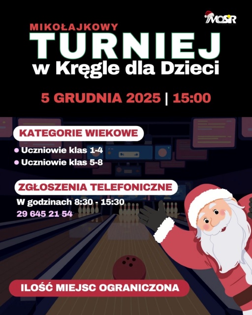 Miejski Ośrodek Sportu i Rekreacji w Ostrowi Mazowieckiej zaprasza wszystkie dzieci ze szkół podstawowych do udziału w wyjątkowym Mikołajkowym Turnieju w Kręgle, który odbędzie się 5 grudnia 2025 roku o godzinie 15:00 w miejscowej kręgielni MOSiR. To doskonała okazja, by rozpocząć mikołajkowy czas pełen sportowych emocji, rywalizacji i dobrej zabawy.