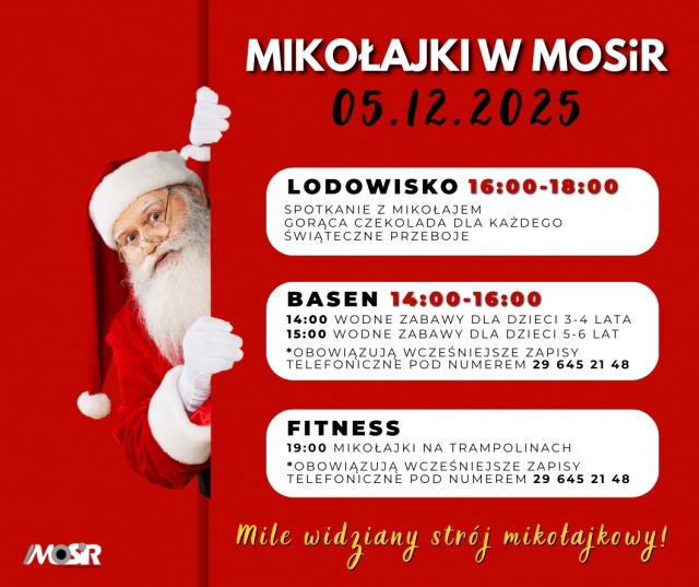 Program wydarzenia rozpocznie się na basenie, gdzie w godz. 14:00-16:00 odbędą się wodne gry i zabawy dla najmłodszych. Zajęcia zostały podzielone na dwie grupy wiekowe: o godz. 14:00 dla dzieci w wieku 3-4 lat oraz o godz. 15:00 dla dzieci w wieku 5-6 lat (obowiązują zapisy). Następnie, w godz. 16:00-18:00, na lodowisku MOSiR zorganizowana zostanie mikołajkowa ślizgawka z udziałem Świętego Mikołaja, gorącą czekoladą i oprawą muzyczną w postaci świątecznych przebojów.
