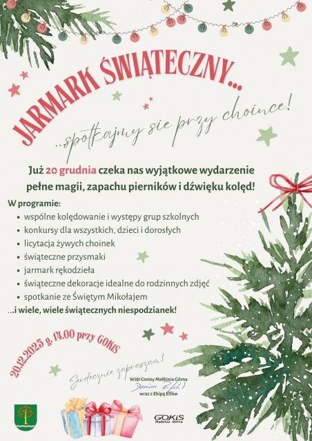 Święta Bożego Narodzenia kojarzą się przede wszystkim z ciepłem, życzliwością oraz radością płynącą z obdarowywania innych. Jarmark świąteczny w Małkini Górnej to nie tylko wydarzenie o charakterze kulturalnym, to przede wszystkim szansa na budowanie wspólnoty i tworzenie atmosfery rodzinnych świąt. Organizatorzy zachęcają wszystkich mieszkańców do wzięcia udziału w tym spotkaniu przy choince.