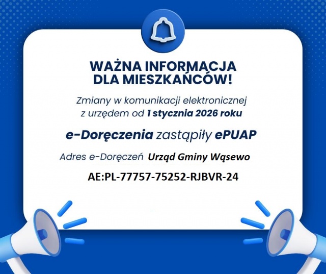 Wysyłanie pism do Urzędu Gminy Wąsewo za pośrednictwem platformy ePUAP po 31 grudnia 2025 nie będzie uznawane za skuteczne doręczenie. Jedyną prawidłową formą elektronicznego doręczenia korespondencji do urzędu stanie się usługa e-Doręczenia dostępna pod adresem: https://www.gov.pl/web/e-doreczenia.