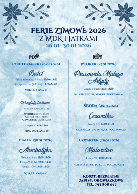 Udział we wszystkich zajęciach jest bezpłatny, jednak liczba miejsc jest ograniczona. Obowiązują wcześniejsze zapisy pod numerem telefonu 793 808 057. Organizatorzy zachęcają do szybkiego zgłaszania udziału i skorzystania z feryjnej oferty pełnej sztuki, ruchu i dobrej zabawy.