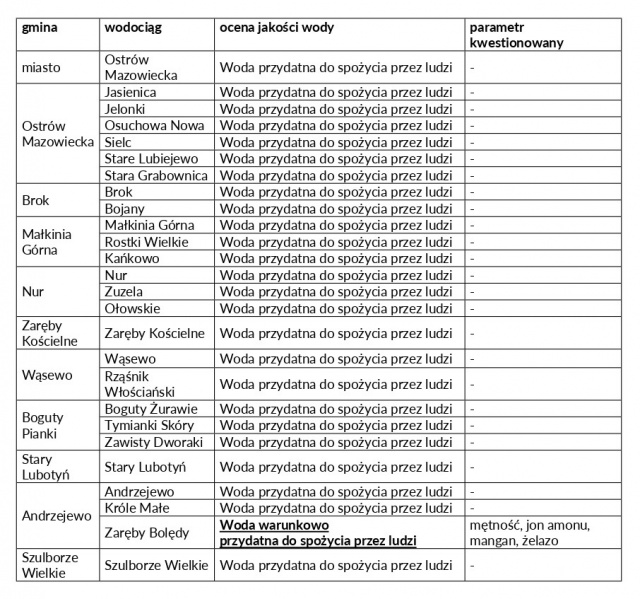 Wyniki raportu wskazują, że woda pochodząca z większości wodociągów w powiecie ostrowskim nadaje się do spożycia i nie stwierdzono w nich uchybień. Sanepid nie zgłosił zastrzeżeń wobec jakości wody w mieście Ostrów Mazowiecka i gminach: Boguty-Pianki, Brok, Małkinia Górna, Nur, Ostrów Mazowiecka, Stary Lubotyń, Szulborze Wielkie, Wąsewo oraz Zaręby Kościelne.