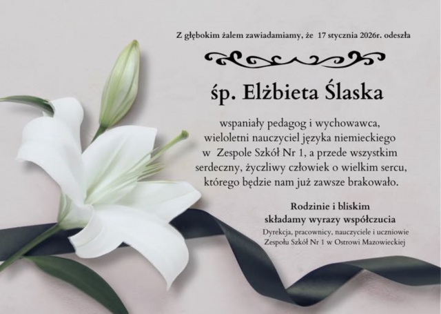Dyrekcja oraz cała społeczność Zespołu Szkół Nr 1 w Ostrowi Mazowieckiej składają najszczersze wyrazy współczucia Rodzinie oraz Najbliższym Zmarłej. Pamięć o Elżbiecie Ślaskiej na trwałe pozostanie w historii szkoły i w sercach tych, których uczyła i wychowywała.