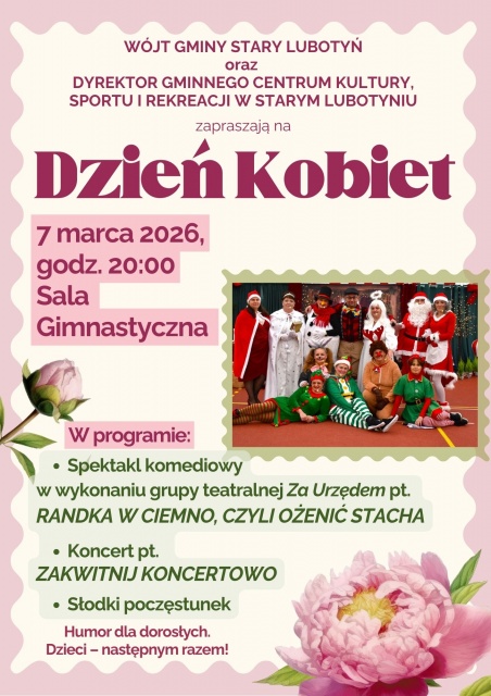 Wydarzenie w całości przygotowała grupa teatralna Za Urzędem: od pomysłu i scenariusza, przez role i dialogi, aż po autorską scenografię. Wydarzenie odbędzie się 7 marca 2026 o godz. 20:00 w sali gimnastycznej Szkoły Podstawowej im. Jana Pawła II - Papieża Polaka w Starym Lubotyniu; wstęp jest wolny. Propozycja jest skierowana dla dorosłych widzów, tym razem dzieci będą mieć wolny wieczór, a dorośli spokojnie zanurzyć się w teatralno-koncertowej atmosferze.