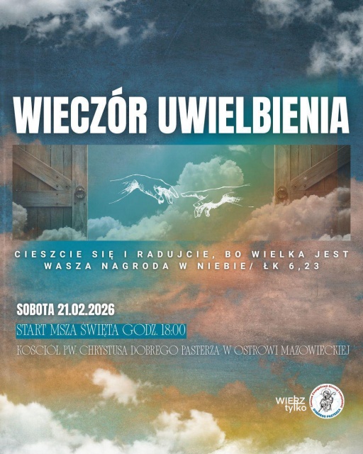 Parafia pw. Chrystusa Dobrego Pasterza w Ostrowi Mazowieckiej serdecznie zaprasza wiernych na wielkopostny wieczór uwielbienia, który odbędzie się w sobotę, 21 lutego 2026. Duchowe wydarzenie będzie okazją do wspólnej modlitwy i refleksji w okresie przygotowania do świąt wielkanocnych. Wydarzenie rozpocznie się uroczystą mszą świętą o godz. 18:00, po której zaplanowano adorację Najświętszego Sakramentu oraz modlitwę uwielbienia. Będzie to czas spotkania z Jezusem Chrystusem, pozwalający na pogłębienie relacji z Bogiem i doświadczenie jego obecności we wspólnocie parafialnej.