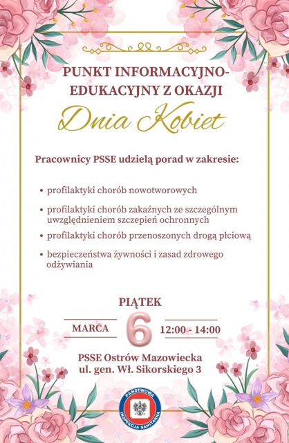 Powiatowa Stacja Sanitarno-Epidemiologiczna w Ostrowi Mazowieckiej serdecznie zaprasza wszystkie zainteresowane panie do odwiedzenia punktu informacyjno-edukacyjnego. Wizyta nie wymaga wcześniejszej rejestracji, wystarczy pojawić się w siedzibie Powiatowej Stacji Sanitarno-Epidemiologicznej, w piątek, 6 marca 2026, między godz. 12:00 a 14:00.