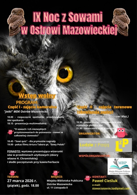 Szczególną atrakcją dziewiątej "Nocy z Sowami" będzie wyjazd terenowy w okolice Ostrowi Mazowieckiej, zaplanowany po części stacjonarnej. Jeśli pozwolą warunki atmosferyczne, uczestnicy pod okiem prowadzącego wyruszą w plener, by nasłuchiwać i obserwować sowy w ich naturalnym środowisku. Zakończenie zajęć terenowych przewidziane jest na godz. 21:30.