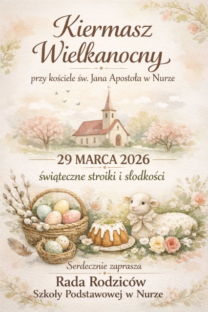 W niedzielę, 29 marca 2026, przy kościele św. Jana Apostoła w Nurze odbędzie się kiermasz wielkanocny, organizowany przez radę rodziców Szkoły Podstawowej im. Marii Konopnickiej w Nurze. Wydarzenie wpisuje się w tradycję przedświątecznych spotkań lokalnej społeczności, które łączą radość z przygotowań do Wielkanocy z możliwością wsparcia różnych inicjatyw. Na odwiedzających czekać będą ręcznie wykonane stroiki wielkanocne oraz domowe słodkości, przygotowane z zaangażowaniem przez rodziców i uczniów nurskiej podstawówki.