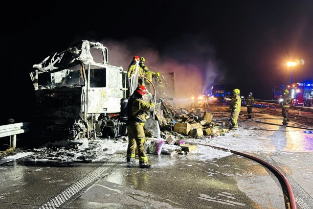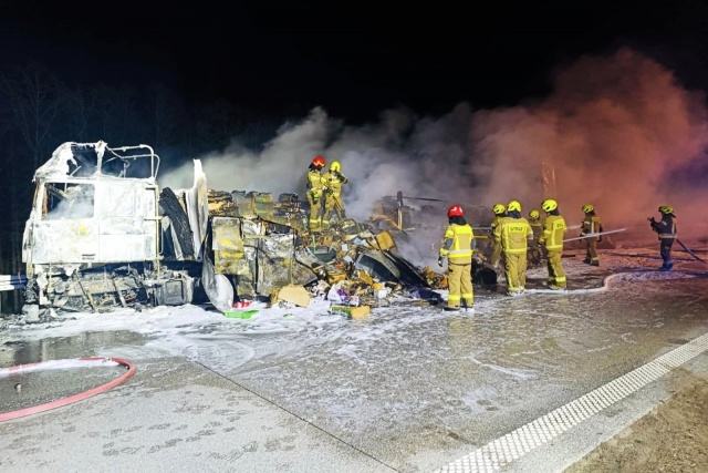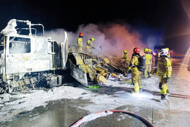 Dopiero w godzinach nocnych strażakom udało się opanować pożar i udrożnić jeden pas ruchu. Usuwanie pojazdów - w tym doszczętnie spalonej ciężarówki - oraz sprzątanie nawierzchni trwało do godz. 4:00 rano we wtorek.