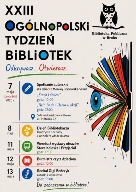 Biblioteka Publiczna w Broku zaprasza dzieci, młodzież i dorosłych do wspólnego świętowania. Organizatorzy podkreślają, że każdy znajdzie coś dla siebie, a cały tydzień będzie doskonałą okazją do spotkań, rozmów i odkrywania świata książek na nowo.