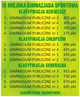 W klasyfikacji generalnej oraz dziewcząt i chłopców zwyciężyli uczniowie Gimnazjum Publicznego nr 3 z dość dużą przewagą punktową nad reprezentantami GP nr 4.