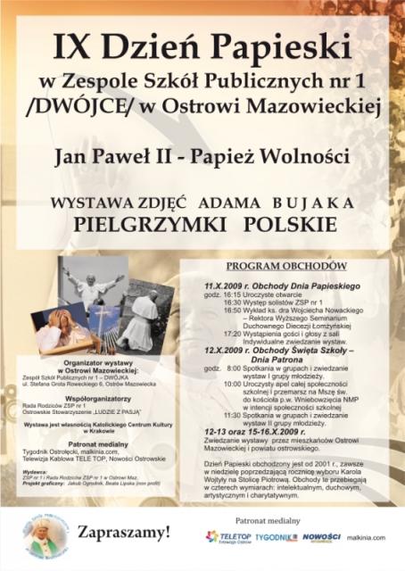Ufamy, że IX Dzień Papieski obchodzony 11 października 2009 roku, pod hasłem Jan Paweł II - Papież Wolności, będzie świetną okazją by w łączności z Piotrem Obecnych Czasów, Ojcem Świętym Benedyktem XVI podjąć na nowo modlitwę o wolność, a także powrócić do papieskiej myśli i wyzwolić jakże potrzebną motywację do podejmowania koniecznych zadań. Wierzymy, że czyniąc to, spłacamy dług wdzięczności Bogu za ten wyjątkowy Pontyfikat.