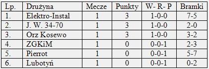 Gra w pierwszej kolejce była atrakcyjna dla oka. W sześciu spotkaniach strzelono 38 bramek i tylko drużyna Lubotynia nie była w stanie pokonać bramkarza rywali. Indywidualnie wyróżnił się Adam Barzał z drużyny Pierrota, który strzelił 4 gole. Dwóch innych zawodników ustrzeliło hat-tricka. Sytuacja w tabelach wygląda niezwykle interesująco. W kolejnych meczach może się jeszcze dużo wydarzyć i w tej chwili ciężko wskazać faworytów.