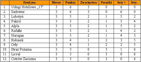 Najwięcej emocji wśród kibiców wzbudził mecz Pakrolu z Orłami i jak się okazało nie bez powodu. Właśnie to spotkanie należało do najbardziej zaciętych w całej 3. kolejce, a o jego ostatecznym rozstrzygnięciu zadecydował tie - break grany na przewagi. Zespół Alpli mądrzejszy o doświadczenia z poprzedniej serii tym razem nie kalkulował, grał konsekwentnie do końca dzięki czemu pokonał Huragan. Solidarne zwycięstwa odnieśli liderzy rozgrywek. Sadowne miało znacznie trudniejsze zadanie, ale mimo to zgarnęło kolejne dwa punkty i idzie łeb w łeb z „17”. Dobrą formę utrzymuje beniaminek z Lubotynia, a zwycięstwo nad „Strażakami” pozwoliło wskoczyć tej drużynie „na pudło”. Rafałki po raz kolejny potwierdziły, że fatalna inauguracja była tylko wypadkiem przy pracy i wcale nie rezygnują z walki o najwyższe cele. Szkoda tylko młodzieży z Liceal, która znowu nieźle grała i znowu… przegrała. Jednak najgroźniejsi rywale już za nimi i teraz może być tylko lepiej.