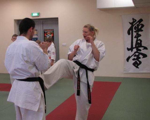 - Na treningu znalazły się przede wszystkim te osoby, które startują na zawodach oraz posiadają już dość zaawansowany poziom wyszkolenia - mówił sensei Radosław Grabowski. - Trening dotyczył właśnie elementów walki oraz poświęcony był efektywniejszej pracy na sprzęcie. Sensei Ania pokazała kilka bardzo ciekawych ćwiczeń poprawiających szybkość i koordynację. Część treningu poświęcona była kontroli dystansu oraz walce w półdystansie.