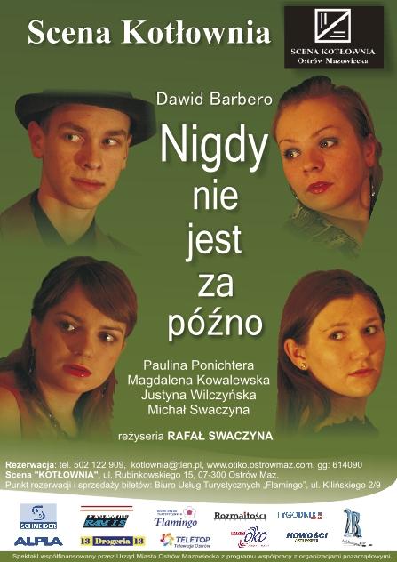 Spektakl można zobaczyć 15 maja 2010 o godz. 19.00 na Scenie Kotłownia na ulicy Rubinkowskiego 15 w Ostrowi Maz.