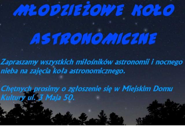 Wszystkich miłośników astronomii i nocnego nieba Miejski Dom Kultury zaprasza wszystkich chętnych do nowo powstałego Młodzieżowego Koła Astronomicznego.