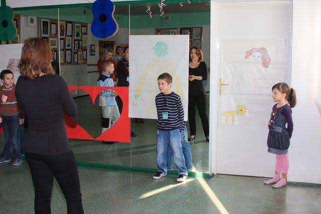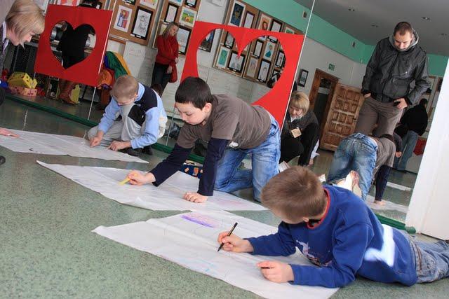 Na początku zaproponowano dzieciom zrobienie charakteryzacji. Nie na sobie, ale na odrysowanym konturze na dużym arkuszu papieru. Każde dziecko miało za zadanie tak udekorować kontur, by przypominało ulubioną postać. Modelka, rycerze, ufoludek, bokser czy królewna. Zabawa zakończyła się wyborem najciekawszej postaci. Zwyciężyły? wszystkie prace. Każdy dostał nagrodę.
