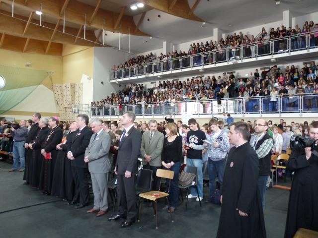 Przybyłych gości - jak podkreślano - przede wszystkim młodzież, wypełniających halę sportową niemal po brzegi, oficjalnie powitali burmistrz Władysław Krzyżanowski, starosta Zbigniew Kamiński, bp pomocniczy Tadeusz Bronakowski oraz ks. dziekan dr Jan Okuła. Ostrowski burmistrz wielokrotnie podkreślił, że zależy mu na jak najlepszym przebiegu tej wizyty, tak by wszyscy czuli się w naszym mieście dobrze i bezpiecznie. Biskup Bronakowski zwrócił uwagę młodych na ciekawą analogię - Zebrało się Was tutaj za sprawą dwojga patronujących świętych ponad 1800 osób. Jan Paweł II wyniósł na ołtarze tylko odrobinę więcej, bo ok. 1900 błogosławionych i świętych. To przepiękne świadectwo.