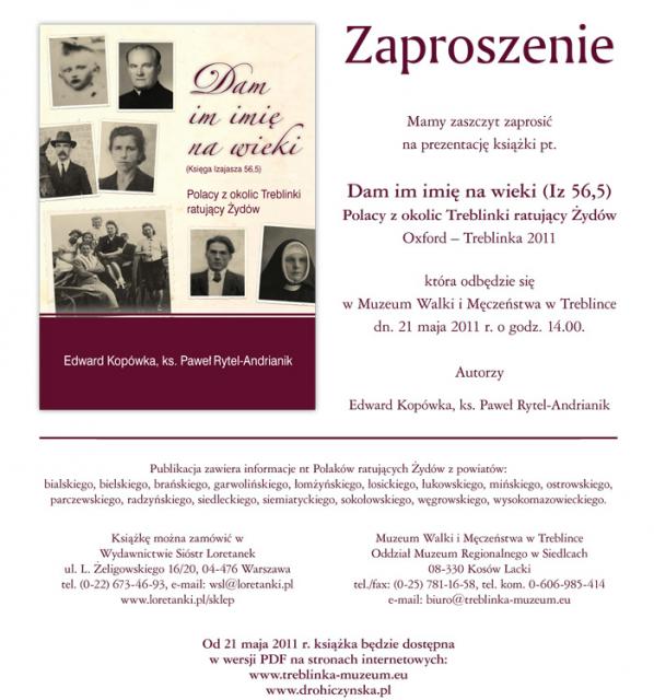 21 maja 2011 r. o godz. 14.00 w Muzeum Walki i Męczeństwa w Treblince odbędzie się prezentacja książki "Dam im imię na wieki (Iz 56,5). Polacy z okolic Treblinki ratujący Żydów".