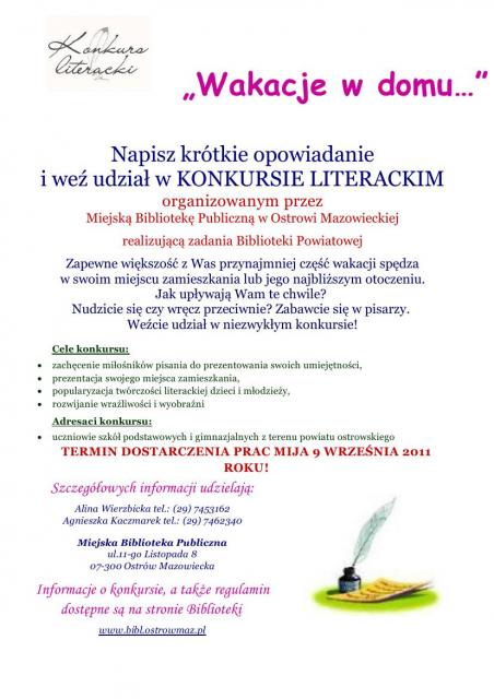 Miejska Biblioteka Publiczna w Ostrowi Mazowieckiej zaprasza do udziału w konkursie na najpiękniejsze opowiadanie "Wakacje w domu".