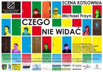 "Czego nie widać", to sztuka Michaela Fryna. Odkrywamy w niej nieco tajemniczy świat teatru zza kulis. Składa się z trzech aktów. W pierwszym, jesteśmy na próbie generalnej. Jednak aktorzy nie radzą sobie z rolami, nie wiedzą w którym momencie mają wejść, kiedy wynieść, a kiedy wnieść rekwizyty. Poznajemy nieco zagmatwane relacje między bohaterami. Po raz pierwszy też poznajemy fragmenty sztuki, którą grają.
