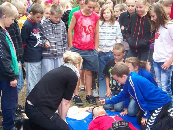 Pani Monika Jastrzębska uczyła dzieci zasad udzielania pierwszej pomocy, które bardzo chętnie brały udział w pokazach oraz zadawały pytania.