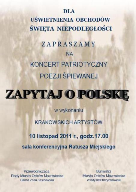 Dla uświetnienia obchodów Święta Niepodległości Burmistrz Miasta Ostrów Mazowiecka Władysław Krzyżanowski zaprasza koncert patriotyczny poezji śpiewanej "Zapytaj o Polskę" w wykonaniu krakowskich artystów.