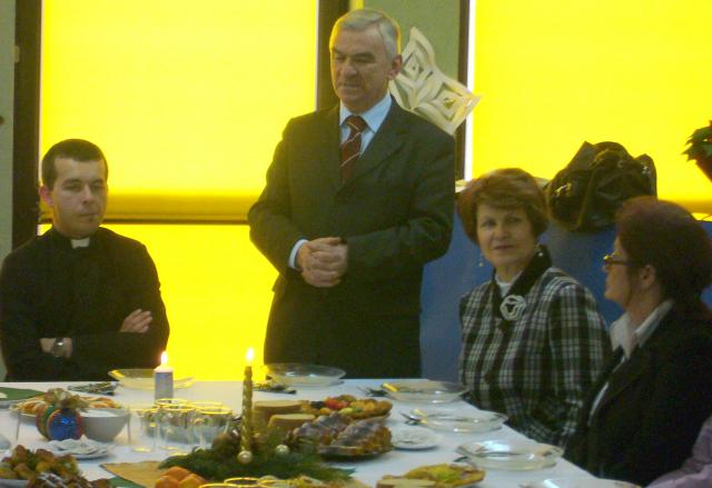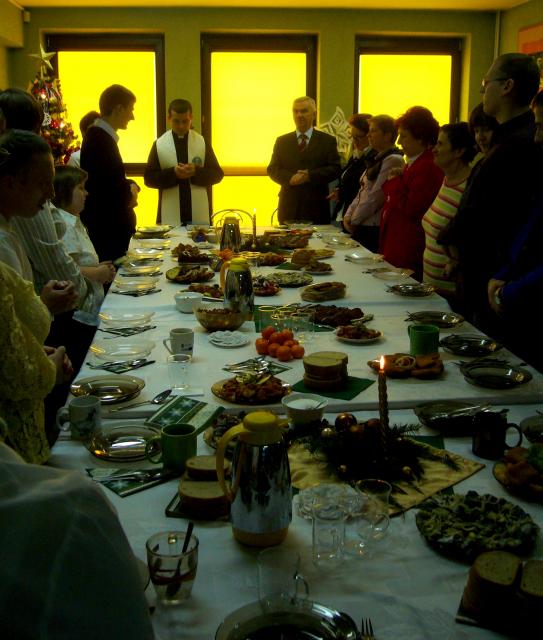 Na pięknie przystrojonym wigilijnym stole znalazły się tradycyjne potrawy - smażone ryby, kapusta wigilijna, ryby po grecku i inne smaczne jedzenie. Po przemowach gości, ksiądz Paweł przeczytał fragment Biblii, a następnie wszyscy podzielili się opłatkiem, składając sobie serdeczne życzenia świąteczne.