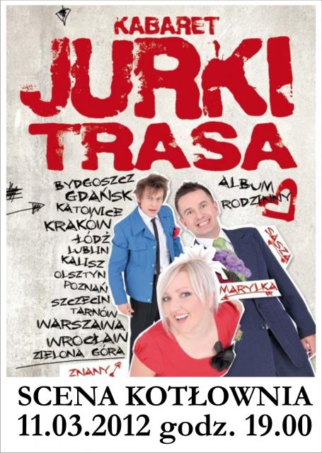 Scena Kotłownia zaprasza na kolejne spotkanie z Kabaretem. 11. Marca 2012 w Ostrowi Mazowieckiej o godz. 19.00 wystąpi znany i lubiany Kabaret Jurki z Zielonej Góry, a tak naprawdę z Zielonogórskiego Zagłębia Kabaretowego. Kabaret chwali się dużą ilością nagród otrzymanych na licznych ważnych festiwalach. Jurki współpracują z Czesuafami, Kabaretem Moralnego Niepokoju, czy Hrabim. Znamy ich między innymi z programu "Spadkobiercy", spotkań z kabaretem na TVP2 oraz z innych realizacji telewizyjnych.