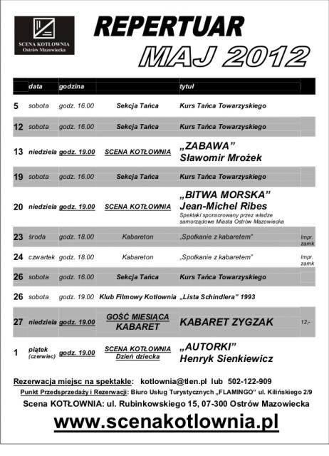 Druga pozycja w maju wartą zobaczenia jest "Bitwa morska" - 20 maja (niedziela) o godzinie 19.00. To trzecia część trylogii, która jest realizowana od 2003 roku. Wraca do tematyki katastrofy statku. Grają Rafał i Michał Swaczyna. Warto pójść, choćby dlatego, że Rafała coraz rzadziej można zobaczyć w nowych produkcjach Kotłowni.